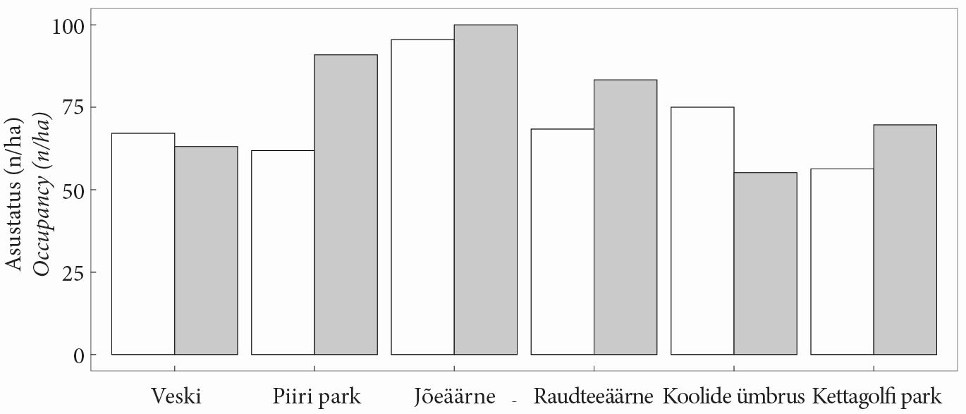 Võiks arvata, et linnamaastikul asustavad linnud rohkem pesakaste, sest pesitsemiseks sobilikke looduslikke õõnsusi on vähem kui loodusmaastikul. Jõgeval asutatigi protsentuaalselt rohkem pesakaste, kuid erinevus Veski külaga polnud väga suur: Jõgeval asustati kolme aasta jooksul keskmiselt 73% pesakastidest, Veski külas asustati kahe aasta jooksul keskmiselt 65% pesakastidest. Asustatuse kõrge protsent loodusmaastikul võib viidata kvaliteetsete looduslike õõnsuste puudumisele, mille põhjus võib olla õõnsusi uuristavate rähnide vähesus või sobivate puude puudumine (näiteks kuusenoorendikes), aga ka sage rüüstamine, mille tõttu võivad pesakastid kui näiliselt kvaliteetsemad pesitsuskohad lindudele atraktiivsemad olla.