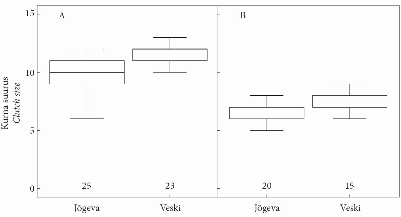 Figure 3. Clutch size of the great tit (A) and the pied flycatcher (B) in the study areas of Jõgeva and Veski villages. The number of broods in each group is shown above the X-axis. The box denotes the quartiles, and the line inside the box is the median.
