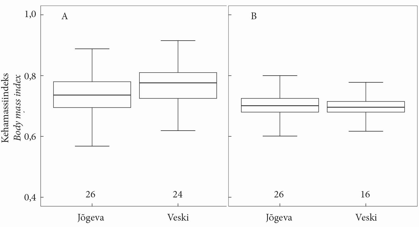 Joonis 5. Rasvatihase (A) ja must-kärbsenäpi (B) poegade kehamassiindeks Jõgeva ja Veski küla uuringualadel. X-telje kohal on esitatud pesade arv igas grupis. Kast näitab kvartiile ja joon kasti see on mediaan.