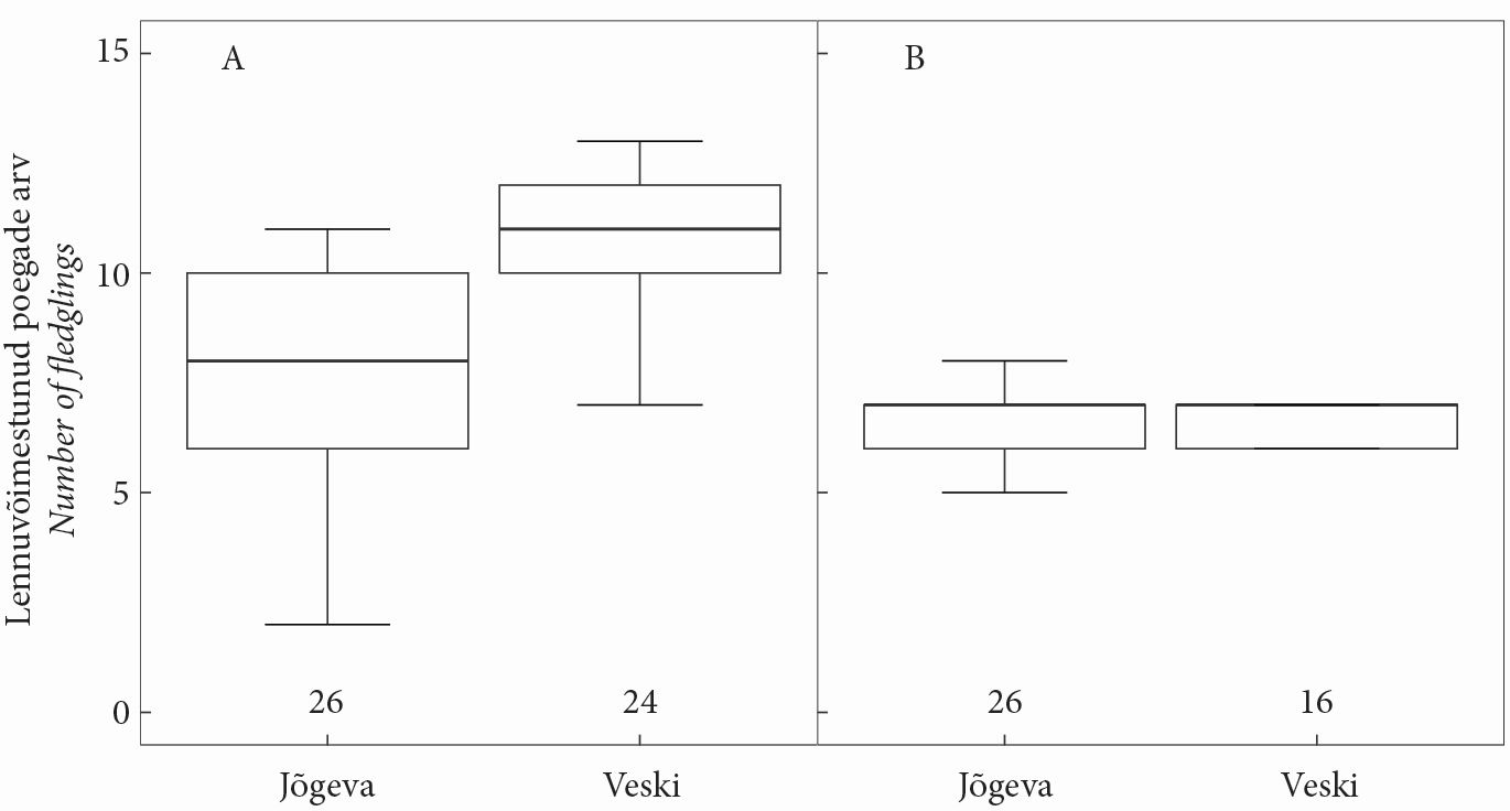 Figure 4. Number of fledglings of the great tit (A) and the pied flycatcher (B) in the study areas of Jõgeva and Veski villages. The number of broods in each group is shown above the X-axis. The box denotes the quartiles, and the line inside the box is the median.