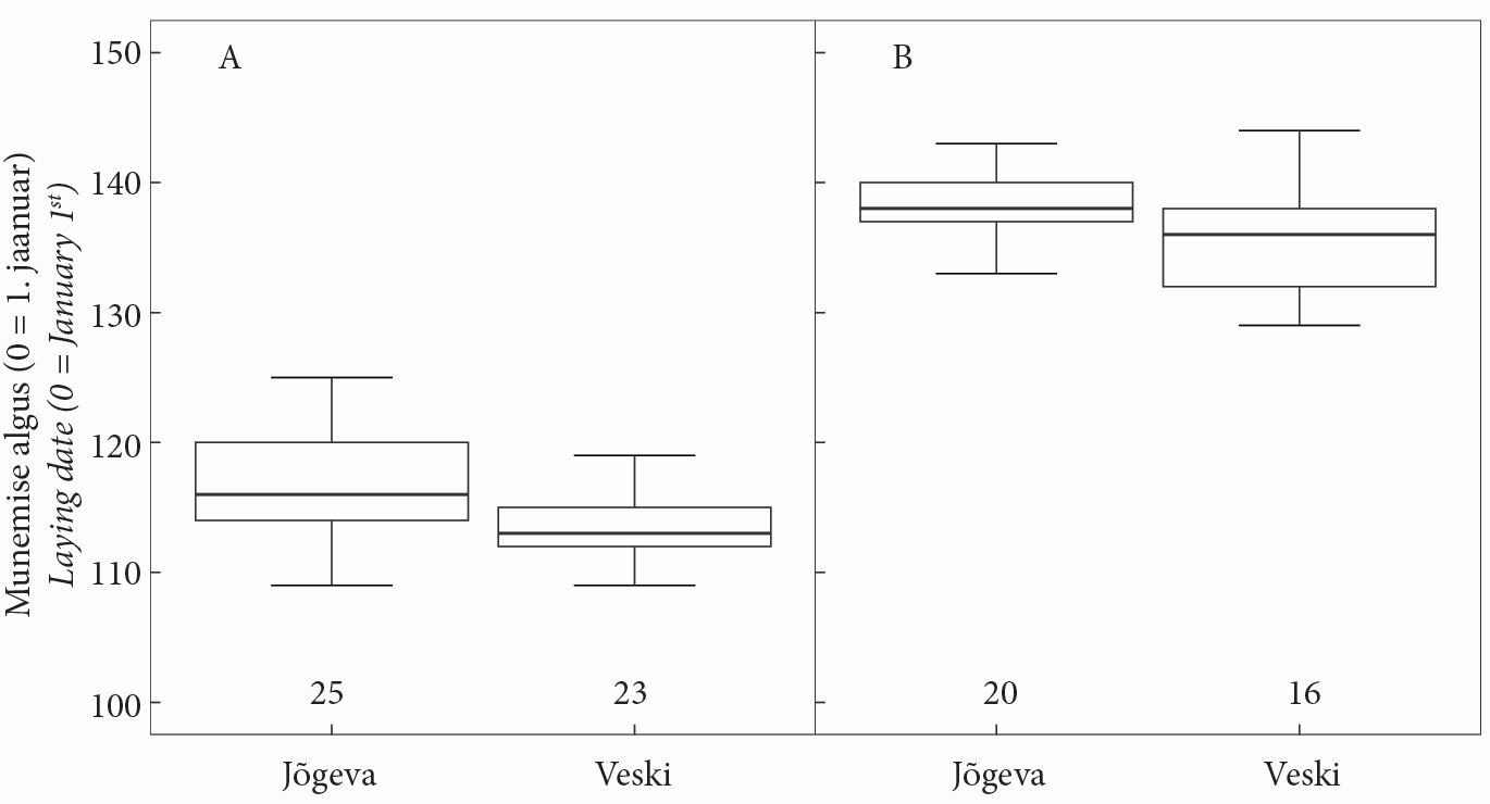 Kuna teised liigid olid vähearvukad, tehti peamised võrdlused rasvatihaste ja must-kärbsenäppide kohta. Rasvatihased alustasid Jõgeval munemist keskmiselt aasta 117. päeval (SD = 5,98), Veski külas aasta 115. päeval (SD = 4,63) ja erinevus kahe piirkonna vahel oli statistiliselt oluline (p < 0,001) (joonis 2A). Must-kärbsenäpid alustasid Jõgeval munemist keskmiselt aasta 139. päeval (SD = 3,40), Veski külas aasta 136. päeval (SD = 3,87) ja erinevus kahe piirkonna vahel oli statistiliselt oluline (p < 0,001) (joonis 2B).