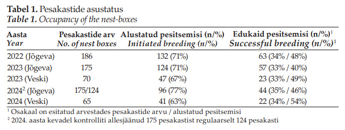 This study evaluates the effectiveness of nest boxes placed in the urban landscape of Jõgeva, based on data collected from 2022 to 2024. To provide an informed assessment, nesting success of cavity-nesting birds within the study area was compared with that of birds using nest boxes in natural habitats. In addition, nest box occupancy, timing of first egg laying, clutch size, number of fledglings, and the body condition index of nestlings were analyzed.