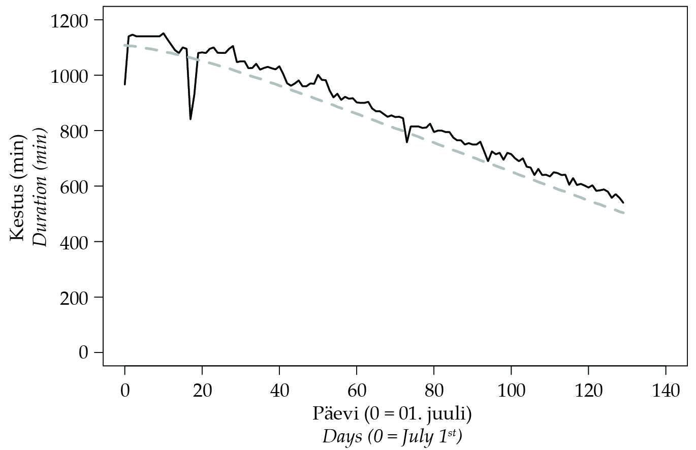 Linde loendati kogu valge aja vältel. Vaid kahel päeval ei katnud loendus kogu valget aega (joonis 1).