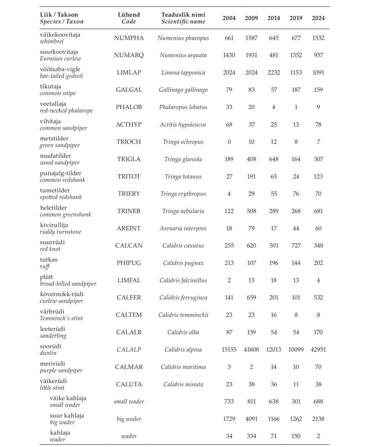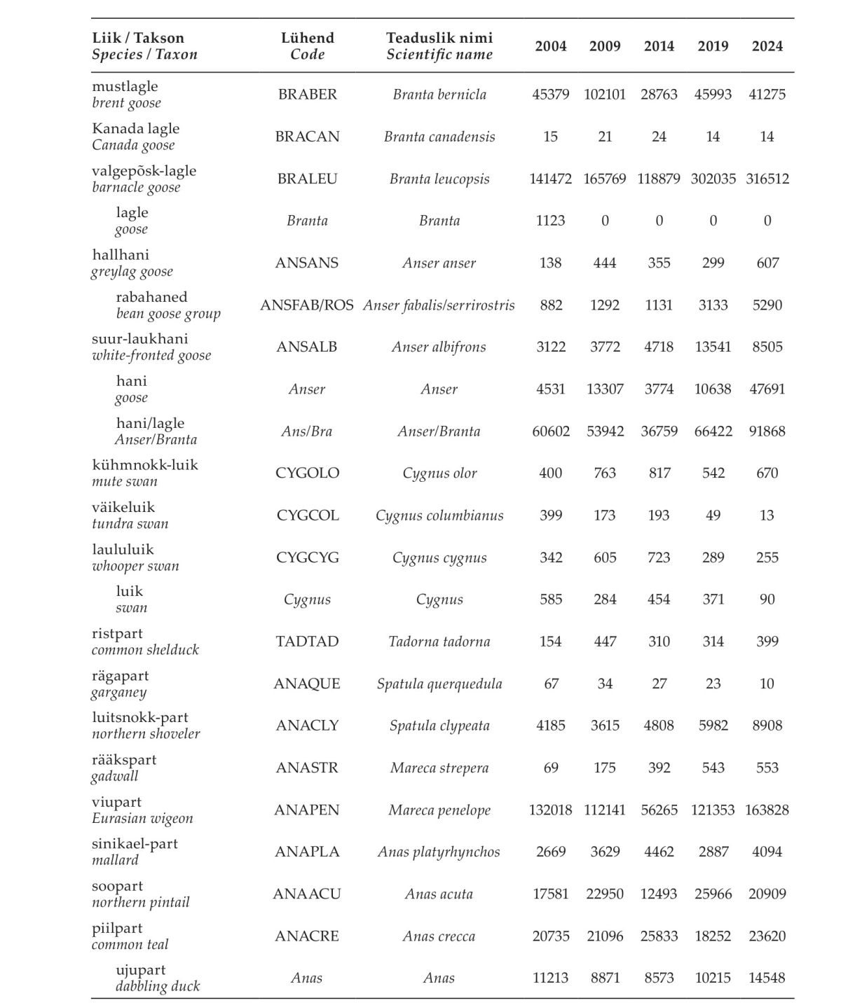 Loendatud kauriliste, pütiliste, haneliste, pelikaniliste ja kurvitsaliste rändesummad on esitatud tabelis 1, kus on lisaks ära näidatud ka eelmiste loendushooaegade rändesummad. Tabel 1 ei sisalda neid haruldasi liike, mis kuulusid 2024. aasta seisuga Eesti Ornitoloogiaühingu harulduste komisjoni käsitletavate liikide hulka. Tabeli summasid uurides tuleb arvestada, et 2004. aasta rändesummade hulgas võivad mitmetel liikidel olla alahinnangud.