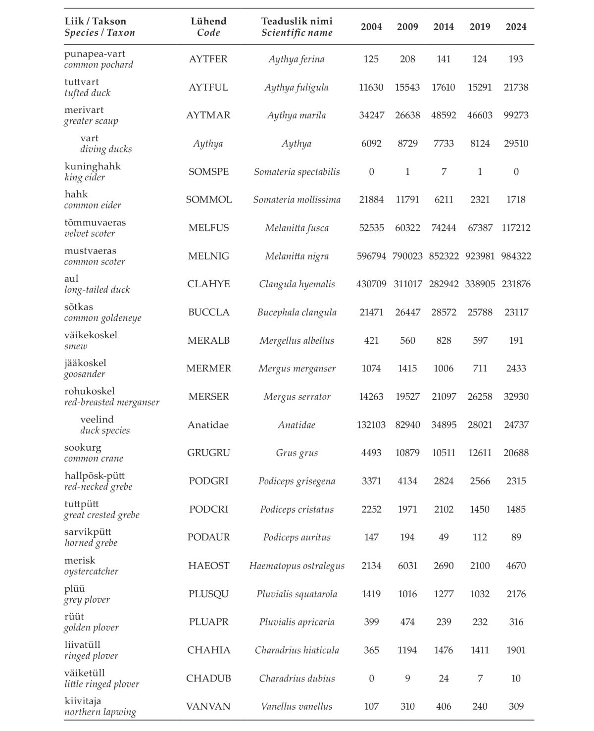 The number of the greater scaup (Aythya marila) increased nearly threefold compared to previous seasons, with 99,273 individuals recorded in 2024. When accounting for unidentified Aythya ducks, the total likely approached 120,000. The tufted duck (Aythya fuligula) also showed an increase, though to a lesser extent. Given the similar migration dynamics and frequent mixed-species flocks, this suggests a recent population increase in scaup. This trend is supported by high counts at Põõsaspea between 2020 and 2023, but further confirmation from other surveys is needed.