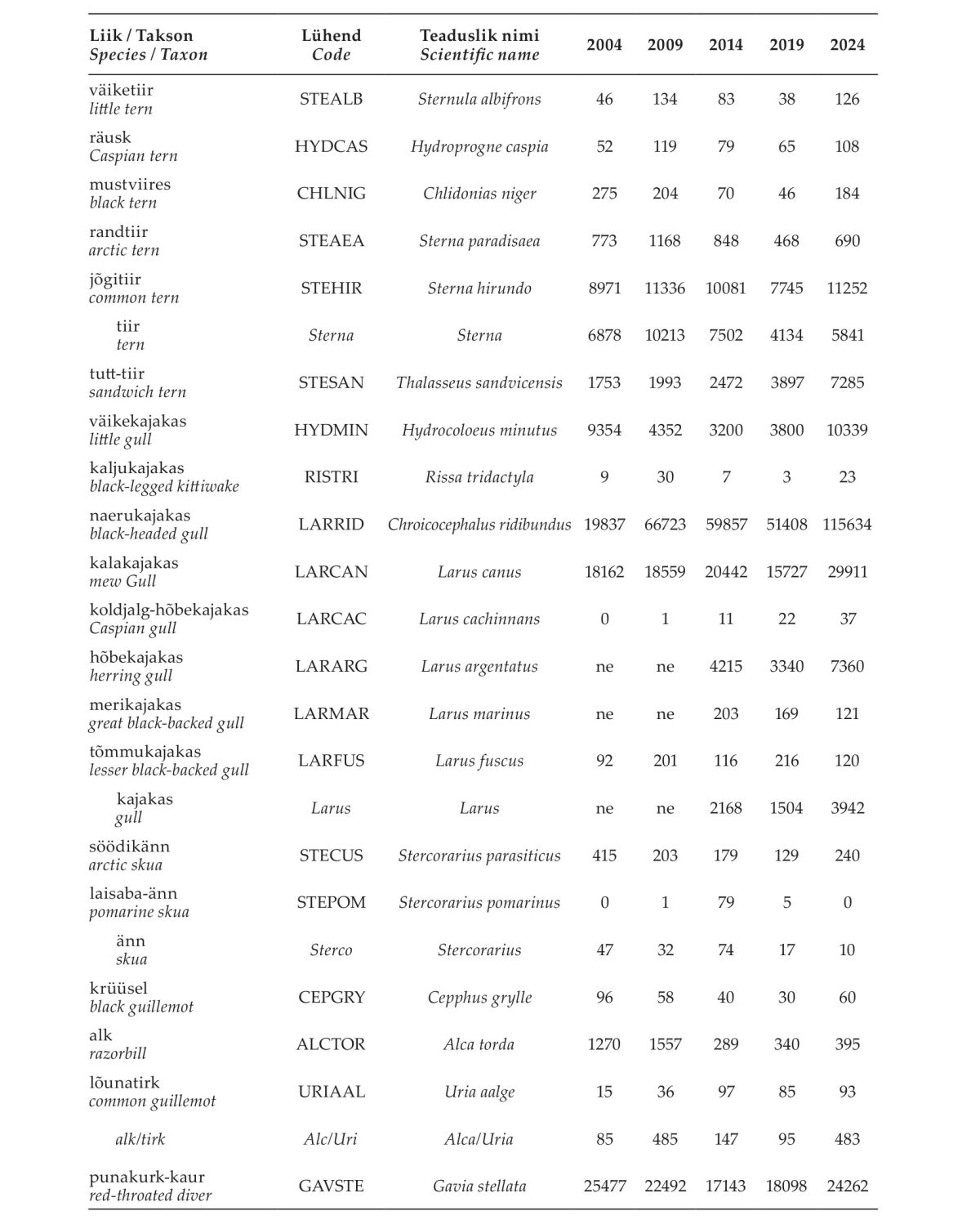 Pütid (Podisceps spp.). Nii tuttpüttide (P. cristatus) kui hallpõsk-püttide (P. grisegena) arvukus on loenduste vältel kahanenud, kuid statistilist olulisust ei testitud. Hallpõsk-püti arvukus on kahanenud viimase nelja loenduse vältel järkjärguliselt ja sarnast suhteliselt aeglast vähenemist on märgatud Hanko linnujaamas (Tringa 2025). Tuttpütil toimus järsk arvukuse kahanemine 2014. ja 2019. aasta projekti vahel. 2024. aasta hooaja summa oli sarnane 2019. aasta hooajaga. Hanko Linnujaama seires on märgata veelgi drastilisemat tuttpüti kahanemist sarnasel perioodil. Sarvikpüttide (P. auritius) rändesumma on loendushooaegade vahel mõnevõrra kõikunud (tabel 1). Väikese valimi tõttu suuri järeldusi teha ei saa, aga kindlasti pole märgata arvukuse kasvu.