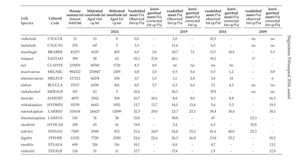 The 2024 autumn season also saw a relatively high number of waders, with 61,600 individuals recorded (Table 1). However, given the overall population sizes of wader species, these numbers remain modest at Põõsaspea, and interpretations should be made cautiously, as counts are highly dependent on favorable wind conditions. An exception is the Eurasian oystercatcher (Haematopus ostralegus), whose population from the White Sea regularly passes the site in good numbers—4,670 individuals were recorded in 2024. The proportion of juveniles was estimated at 10.5%.