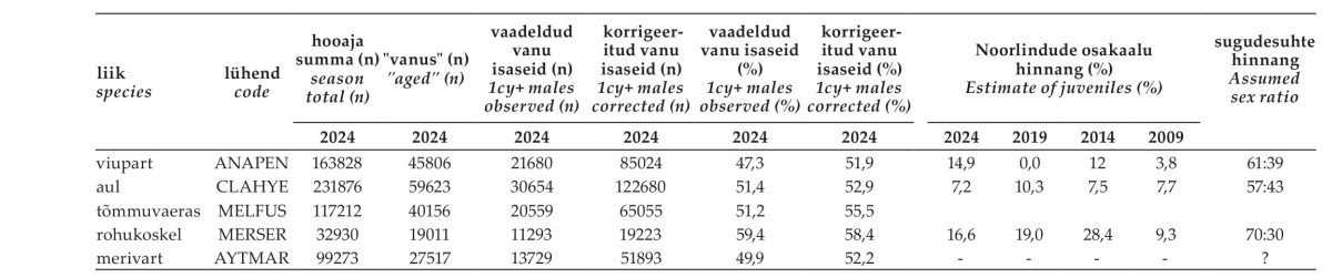 Vardid (Aythya spp.). 2024. aastal loendati läbirändel erakordselt palju merivarte (Aythya marila) – 99 273 isendit ehk umbes kolmandik teada olevast Loode-Euroopa talvitavast populatsioonist (Delany & Scott 2006). Hooaja summa oli 2–3 korda suurem kui varasematel hooaegadel. Vanade isaslindude osakaal rändes oli 52% (tabel 3) ehk väga suur noorte arvukus ei saa seletada arvukuse hüppelist tõusu. On võimalik, et merivardil on toimunud hiljuti arvukuse tõus, millele viitavad ka aastatel 2020–2023 tehtud mitte standardiseeritud loenduste tulemused.