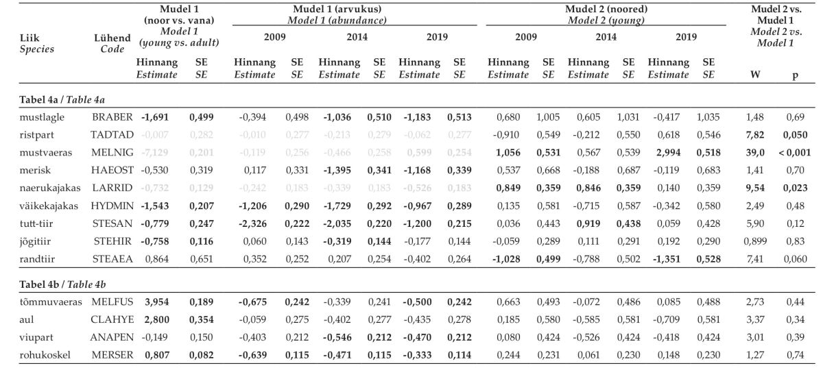 Statistiliste analüüside tulemuste osas (15 liiki) viidatakse tabelile 4 (mudel 1 (arvukus) ja mudel 2 (noored)), kust on liigiti leitavad muutusehinnangute statistikud, standardvead ja hinnangute statistiline olulisus 5% tõenäosuse piires. Tekstis neid väärtusi ei korrata. Tabelite 4a ja 4b mudel 1 (noor vs vana) annab üldise pildi selle kohta, kas rändel kohatakse rohkem vanalinde kui noori või isaslinde kui emassulestikus olevaid.